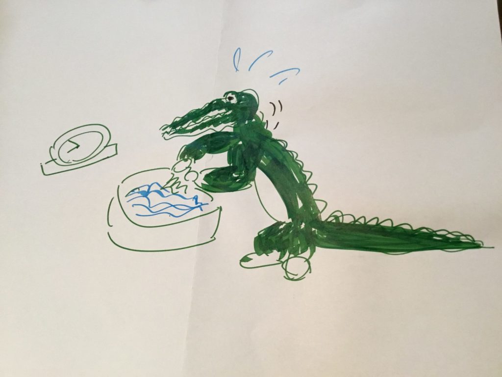 お題は、「時間を気にしてソワソワしながら選択するワニ」でした。