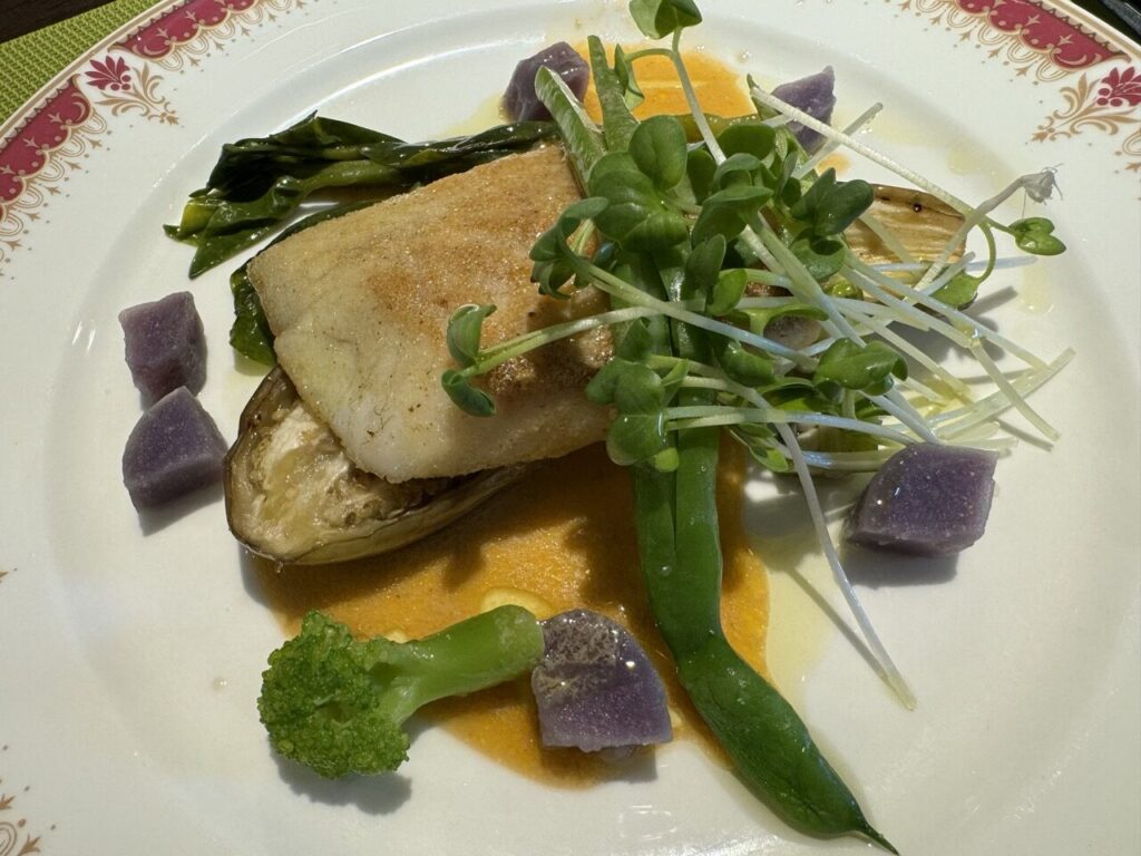 私が選んだメインディッシュは「鯛」でしたが、少し上乗せが必要でした。 鯛は期待以上の美味しさで、しっかりとした味わいと繊細な食感が楽しめました。ドリンクにはノンアルコールワインの白をお願いしましたが、普段飲むワインと遜色ないお味で、メインとの相性も抜群でした。この組み合わせに非常に満足しました。